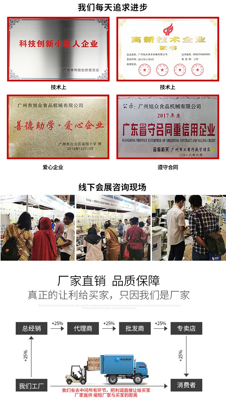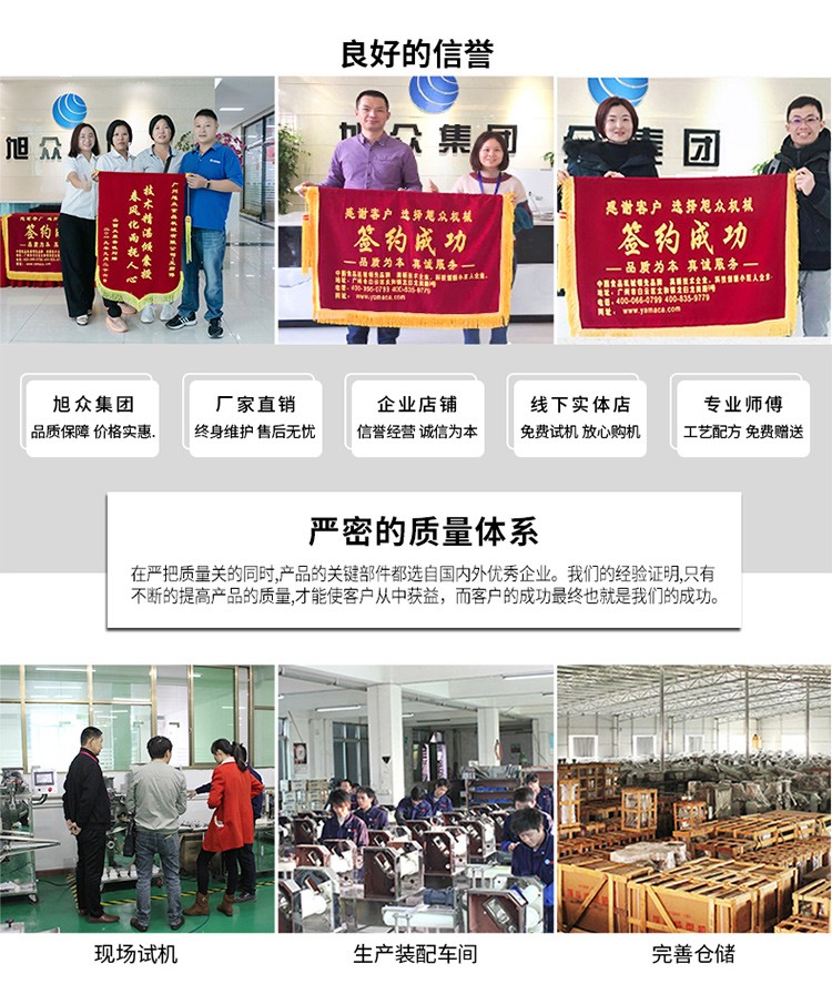 廣州旭眾食品機(jī)械有限公司是一家集科研開發(fā),生產(chǎn)設(shè)計(jì),營銷服務(wù)為一體的現(xiàn)代化生產(chǎn)企業(yè)?,F(xiàn)代化生產(chǎn)車間,精湛制造技術(shù),所產(chǎn)機(jī)械歷經(jīng)市場重重考驗(yàn),不斷贏得海內(nèi)外客戶的贊譽(yù)。