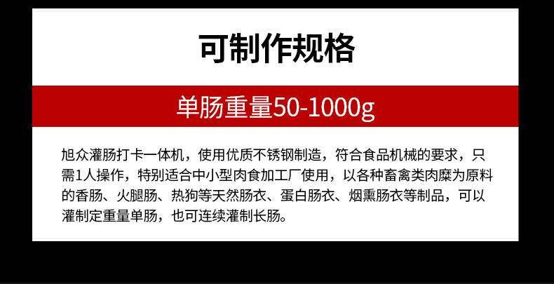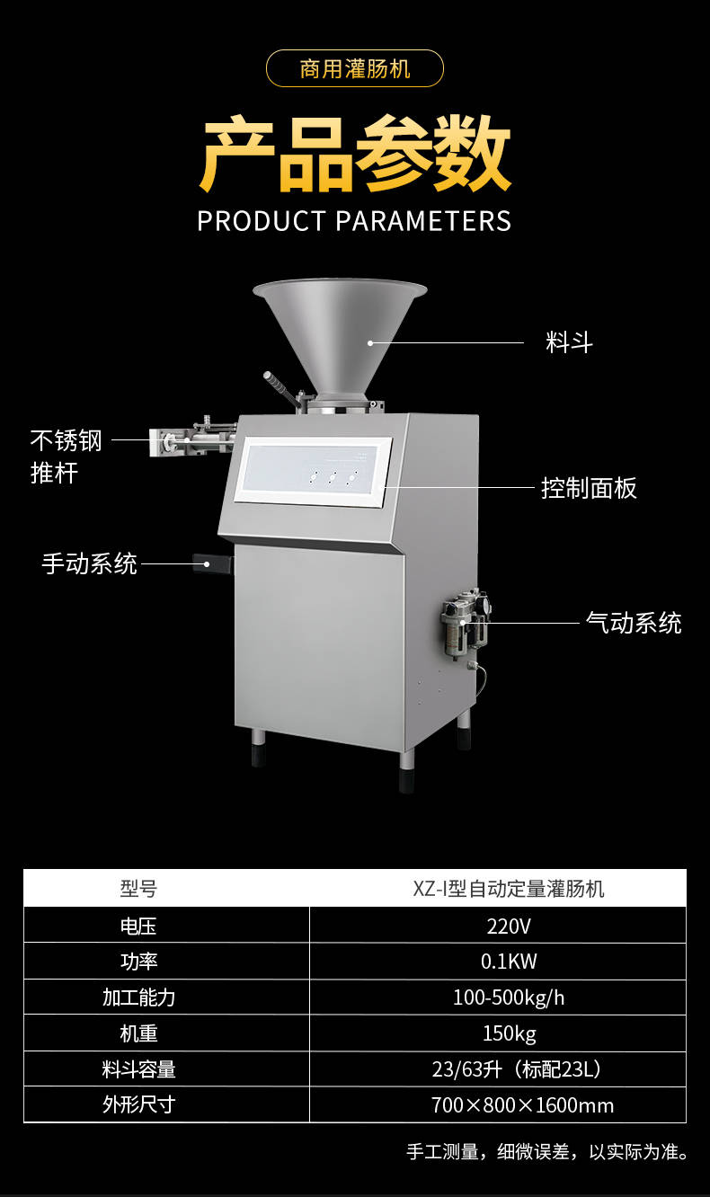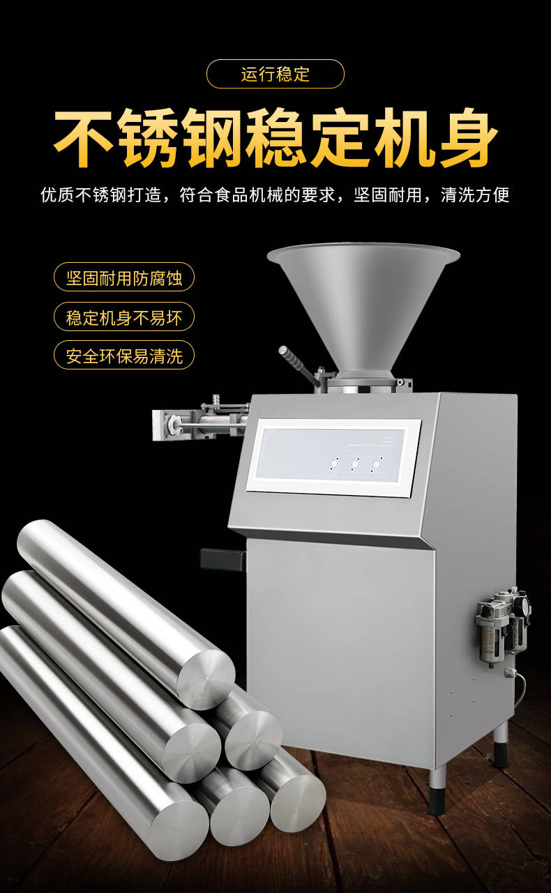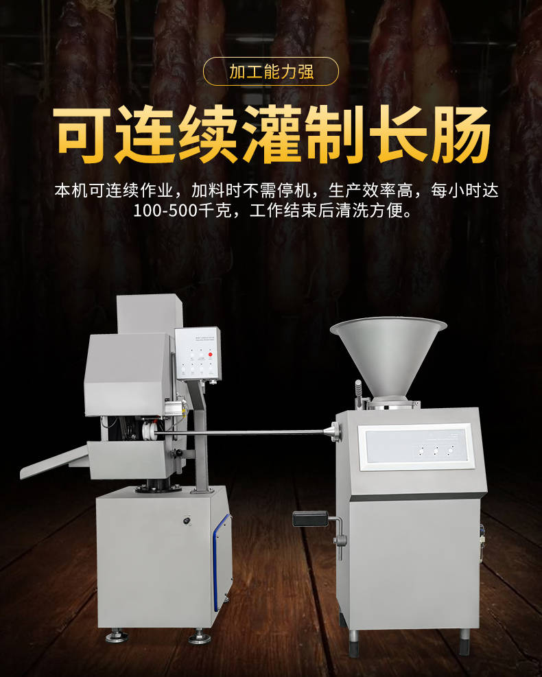 XZ-I型自動定量灌腸機,使用優(yōu)質不銹鋼制造,符合食品機械的要求,只需1人操作,特別適合中小型肉食加工廠使用,以各種畜禽類肉糜為原料的香腸、火腿腸、熱狗等天然腸衣、蛋白腸衣、煙熏腸衣等制品,可以灌制定重量單腸,也可連續(xù)灌制長腸。