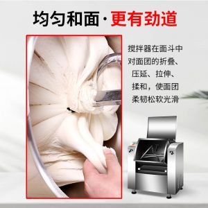 低噪音和面機,利用攪拌器的轉(zhuǎn)動,使面粉和水在面斗中形成小顆粒,粘黏形成大面團塊。大容量翻轉(zhuǎn)面斗,采用優(yōu)質(zhì)不銹鋼焊接制造,防腐蝕,食品接觸安全,符合食品生產(chǎn)安全標準。