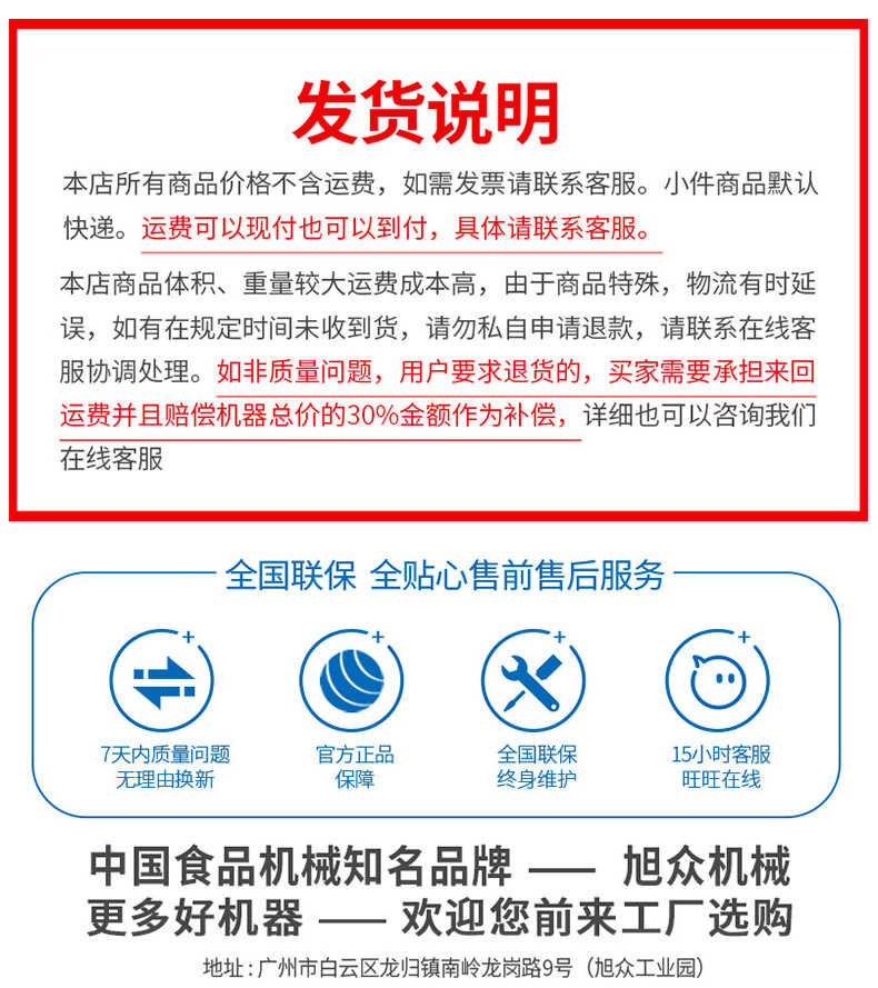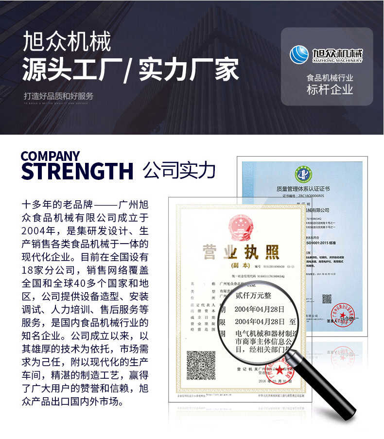 廣州旭眾食品機(jī)械有限公司是一家集科研開發(fā),生產(chǎn)設(shè)計,營銷服務(wù)為一體的現(xiàn)代化生產(chǎn)企業(yè)?,F(xiàn)代化生產(chǎn)車間,精湛制造技術(shù),所產(chǎn)機(jī)械歷經(jīng)市場重重考驗,不斷贏得海內(nèi)外客戶的贊譽(yù)。
