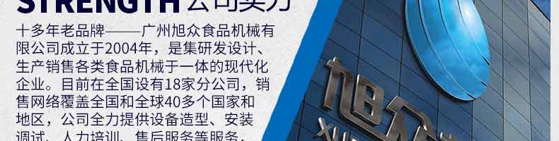 廣州旭眾食品機(jī)械有限公司是一家集科研開發(fā),生產(chǎn)設(shè)計(jì),營銷服務(wù)為一體的現(xiàn)代化生產(chǎn)企業(yè)?,F(xiàn)代化生產(chǎn)車間,精湛制造技術(shù),所產(chǎn)機(jī)械歷經(jīng)市場重重考驗(yàn),不斷贏得海內(nèi)外客戶的贊譽(yù)。