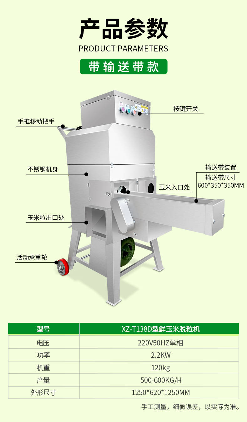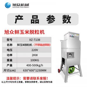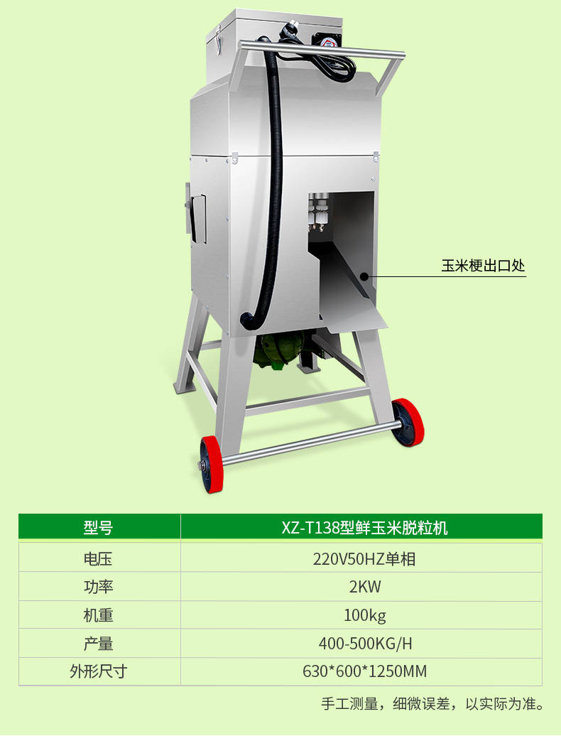 XZ-T138玉米脫粒機(jī),鮮玉米脫粒機(jī),高效脫粒。用于新鮮甜糯玉米脫粒工作,能很方便地把籽粒與梗桿分離。入料方便、脫凈率高、不碎粒不爛芯。每分鐘處理75個(gè)玉米穗。高效脫粒,滿足商用,籽粒產(chǎn)量約為500-600Kg/h
