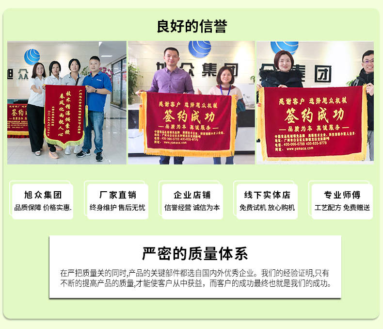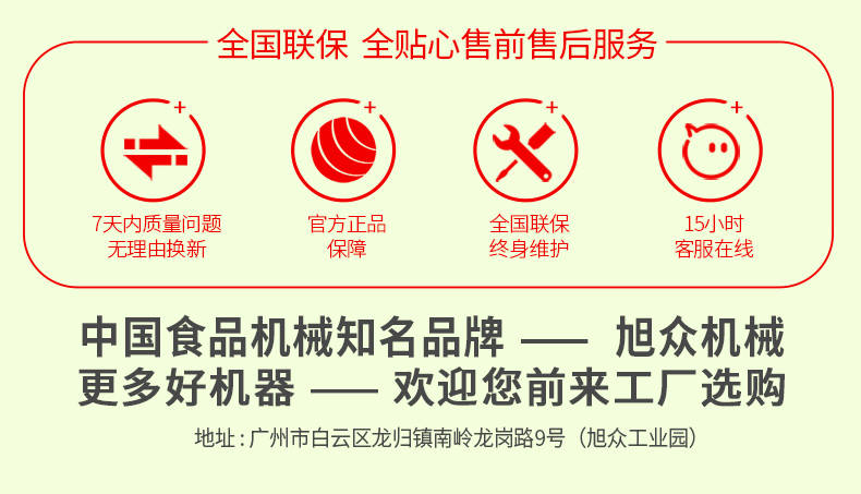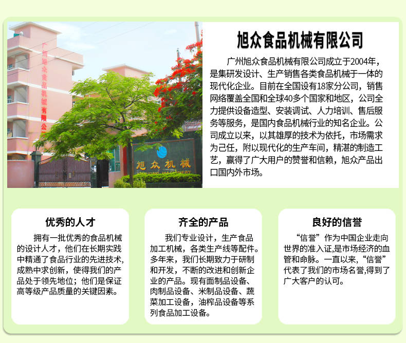 廣州旭眾食品機(jī)械有限公司是一家集科研開發(fā),生產(chǎn)設(shè)計(jì),營(yíng)銷服務(wù)為一體的現(xiàn)代化生產(chǎn)企業(yè)。現(xiàn)代化生產(chǎn)車間,精湛制造技術(shù),所產(chǎn)機(jī)械歷經(jīng)市場(chǎng)重重考驗(yàn),不斷贏得海內(nèi)外客戶的贊譽(yù)。