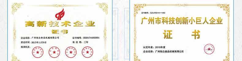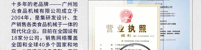 廣州旭眾食品機(jī)械有限公司是一家集科研開發(fā),生產(chǎn)設(shè)計(jì),營(yíng)銷服務(wù)為一體的現(xiàn)代化生產(chǎn)企業(yè)?,F(xiàn)代化生產(chǎn)車間,精湛制造技術(shù),所產(chǎn)機(jī)械歷經(jīng)市場(chǎng)重重考驗(yàn),不斷贏得海內(nèi)外客戶的贊譽(yù)。