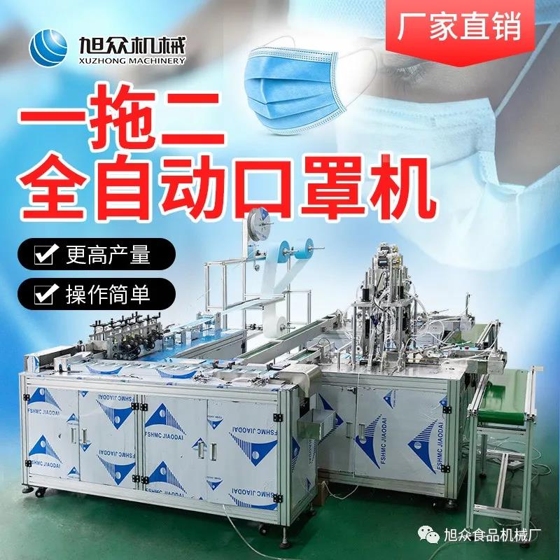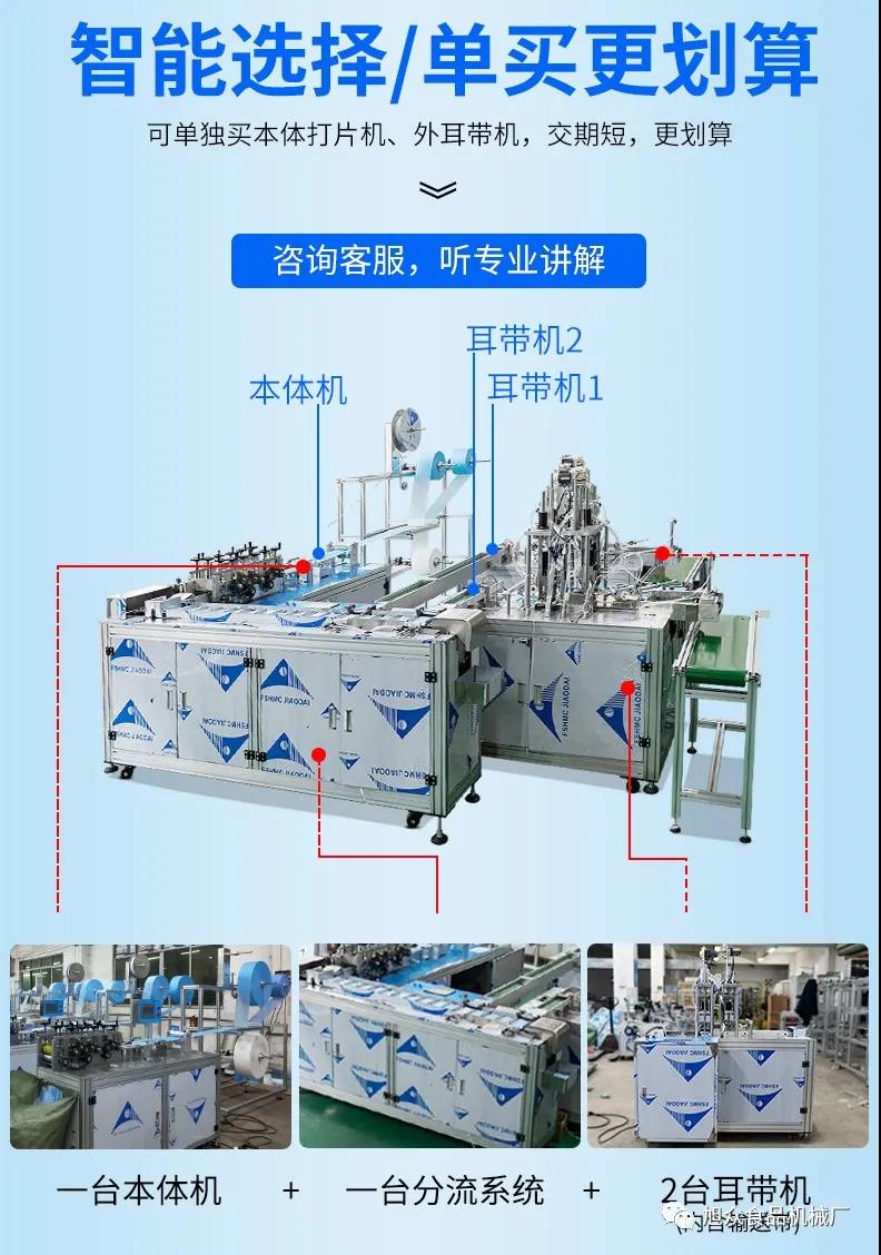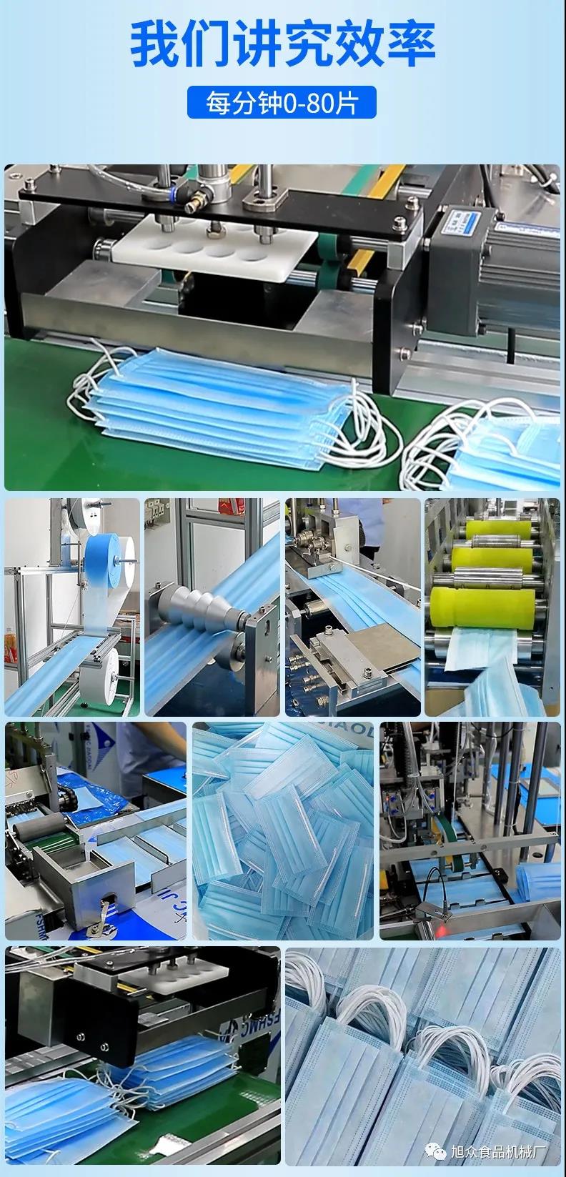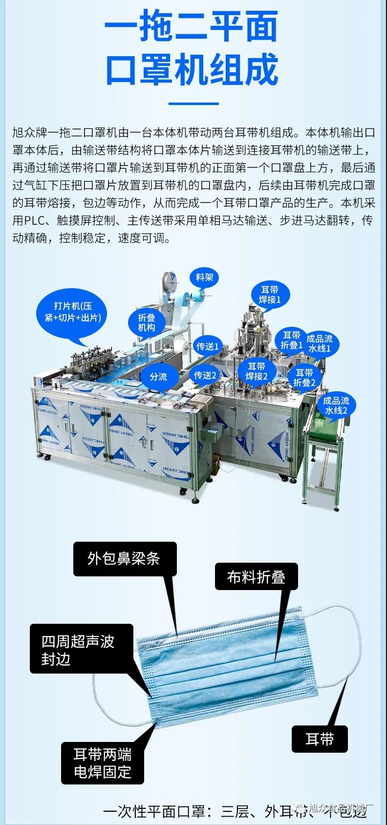 旭眾牌一拖二口罩機由一臺本體機帶動兩臺耳帶機組成。本體機輸出ロ罩本體后,由輸送帶結構將口罩本體片輸送到連接耳帶機的輸送帶上,再通過輸送帶將口罩片輸送到耳帶機的正面第一個口罩盤上方,最后通過氣缸下壓把口罩片放置到耳帶機的口罩盤內(nèi),后續(xù)由耳帶機完成口罩的耳帶熔接,包邊等動作,從而完成一個耳帶口罩產(chǎn)品的生產(chǎn)。本機采用PLC、觸摸屏控制、主傳送帶采用單相馬達輸送、步進馬達翻轉,傳動精確,控制穩(wěn)定,速度可調。