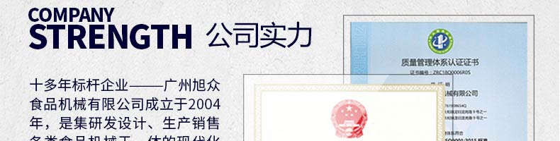 廣州旭眾食品機(jī)械有限公司是一家集科研開發(fā),生產(chǎn)設(shè)計(jì),營銷服務(wù)為一體的現(xiàn)代化生產(chǎn)企業(yè)。現(xiàn)代化生產(chǎn)車間,精湛制造技術(shù),所產(chǎn)機(jī)械歷經(jīng)市場重重考驗(yàn),不斷贏得海內(nèi)外客戶的贊譽(yù)。