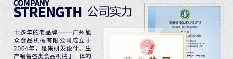 廣州旭眾食品機械有限公司是一家集科研開發(fā),生產(chǎn)設計,營銷服務為一體的現(xiàn)代化生產(chǎn)企業(yè)?,F(xiàn)代化生產(chǎn)車間,精湛制造技術,所產(chǎn)機械歷經(jīng)市場重重考驗,不斷贏得海內(nèi)外客戶的贊譽。