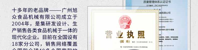 廣州旭眾食品機(jī)械有限公司是一家集科研開發(fā),生產(chǎn)設(shè)計(jì),營銷服務(wù)為一體的現(xiàn)代化生產(chǎn)企業(yè)?,F(xiàn)代化生產(chǎn)車間,精湛制造技術(shù),所產(chǎn)機(jī)械歷經(jīng)市場重重考驗(yàn),不斷贏得海內(nèi)外客戶的贊譽(yù)。